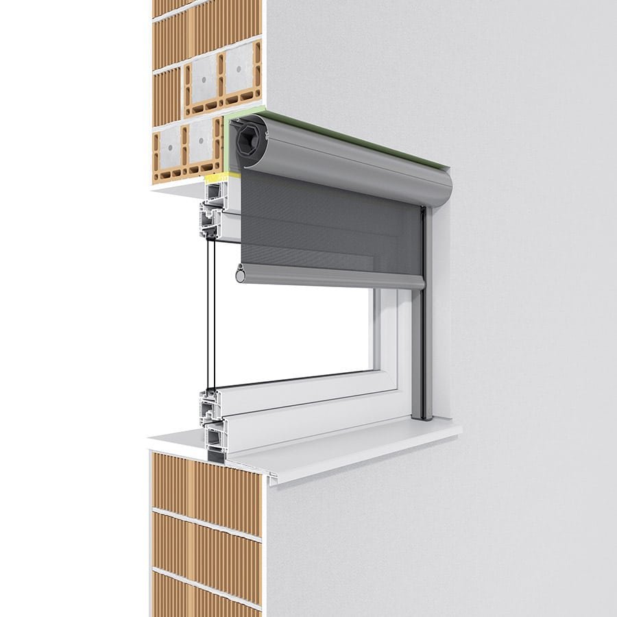 rollSCREEN.2 si monta facilmente sia davanti alla finestra che sul muro. Tenuto in tensione grazie ad un terminale zavorrato, rollSCREEN.2 non è integrato nella guida laterale dell’elemento. Il terminale zavorrato, che tiene il telo in tensione, scompare completamente quando il telo viene avvolto nel cassonetto. Tra il telo e la guida restano quindi alcuni millimetri di spazio. Questo sistema è caratterizzato da angoli a smusso che gli permettono di integrarsi con armonia in ogni tipologia di facciata.
